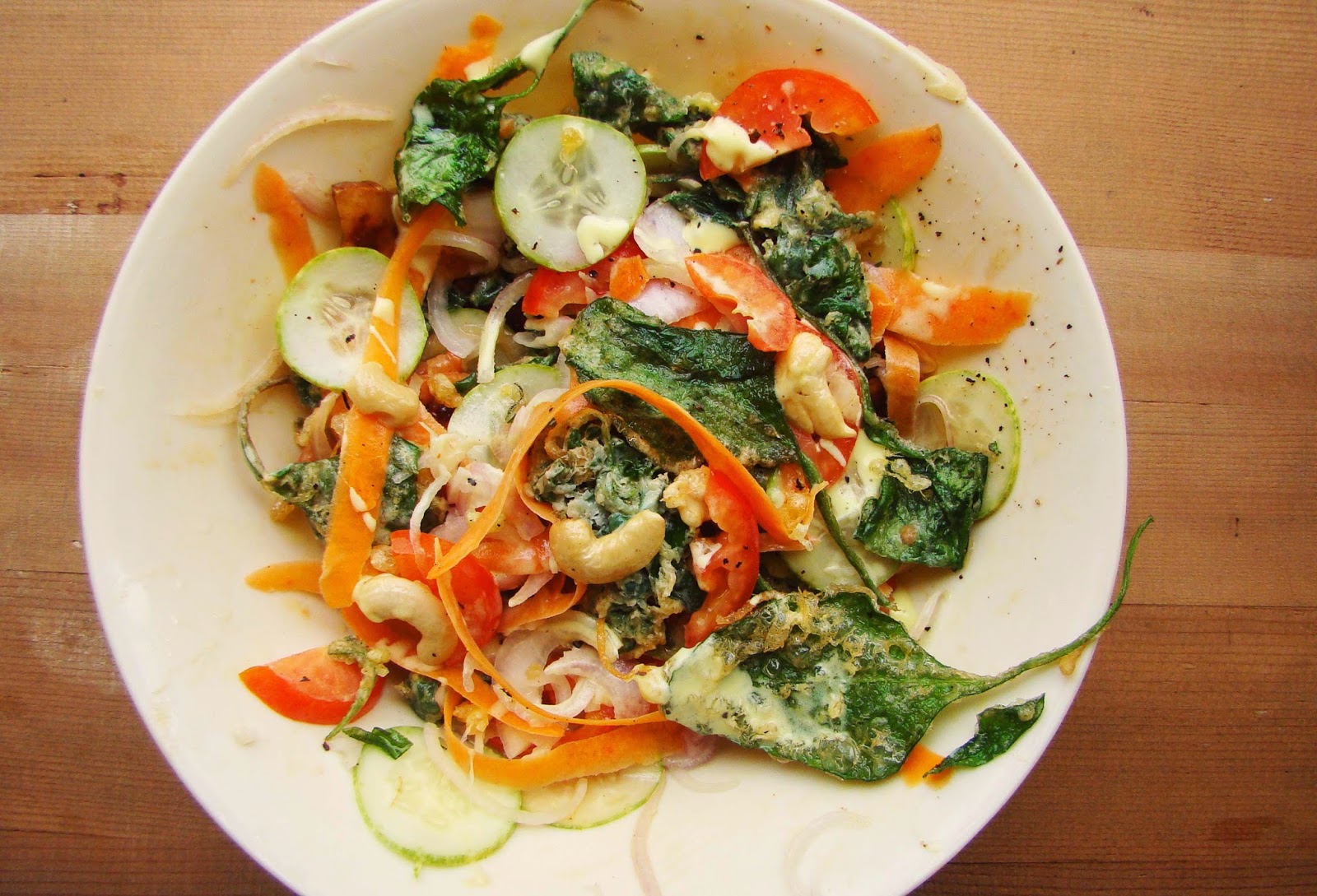 thought the crispy spinach and then I add tomatoes, carrot ribbons, cucumber,