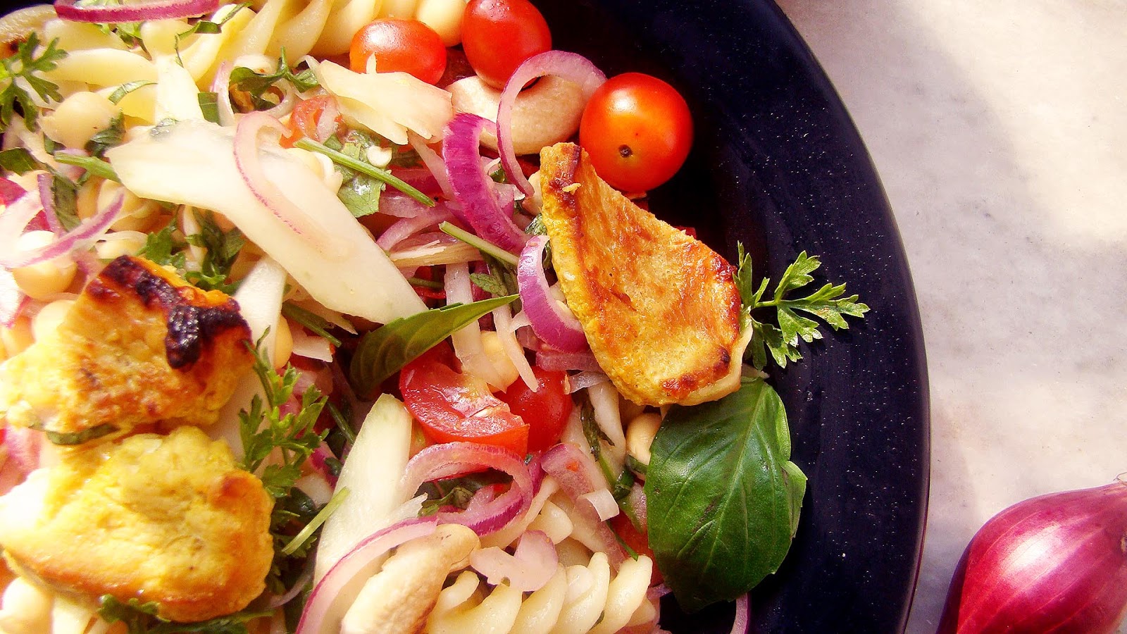 red onion slices, the cherry tomatoes, the herbs, the pasta, the grilled